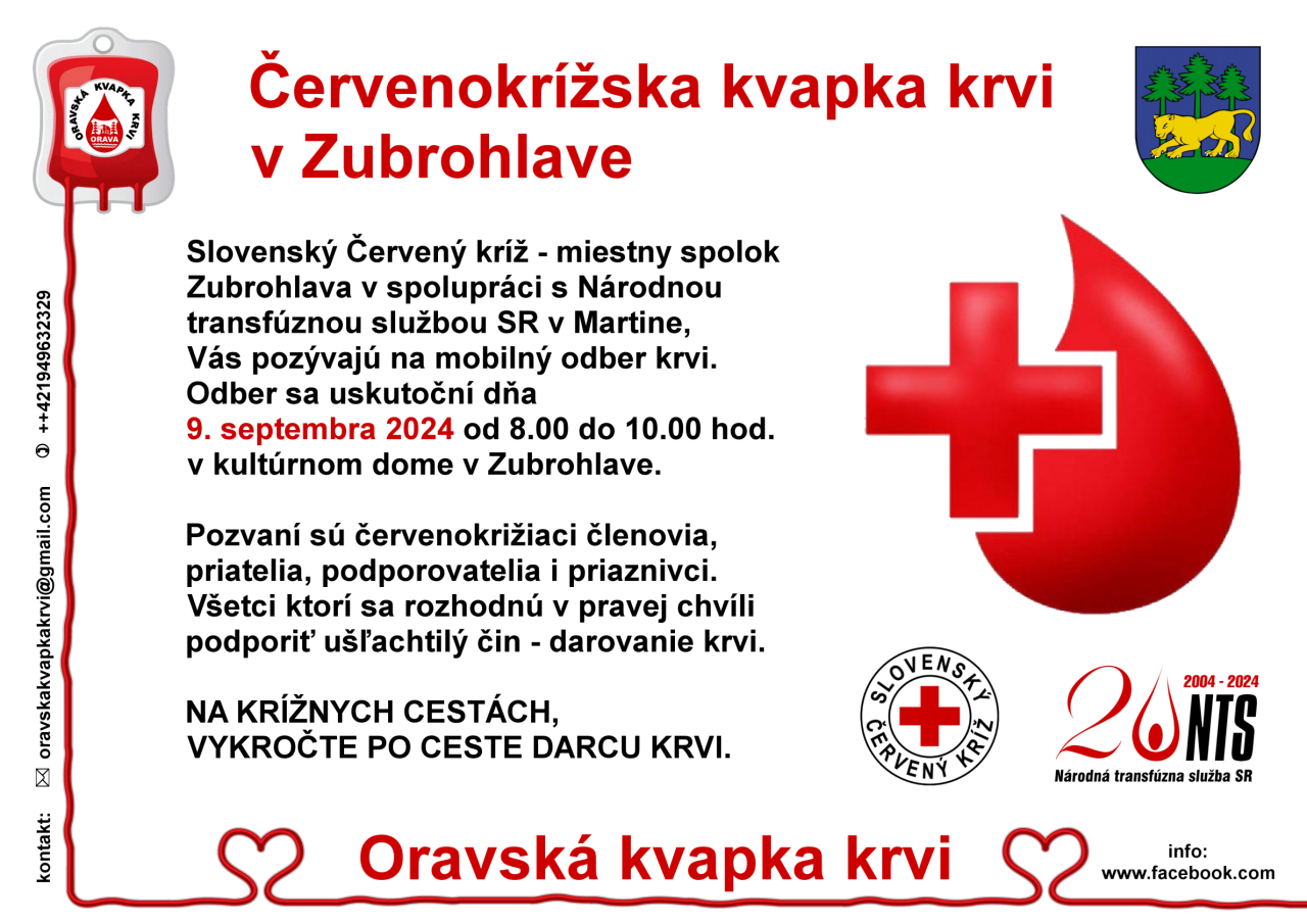 Slovenský Červený kríž - miestny spolok Zubrohlava v spolupráci s Národnou transfúznou službou SR v Martine, Vás pozývajú na mobilný odber krvi. Odber sa uskutoční dňa 9. septembra 2024 od 8:00 do 10:00 hod. v kultúrnom dome v Zubrohlave.
