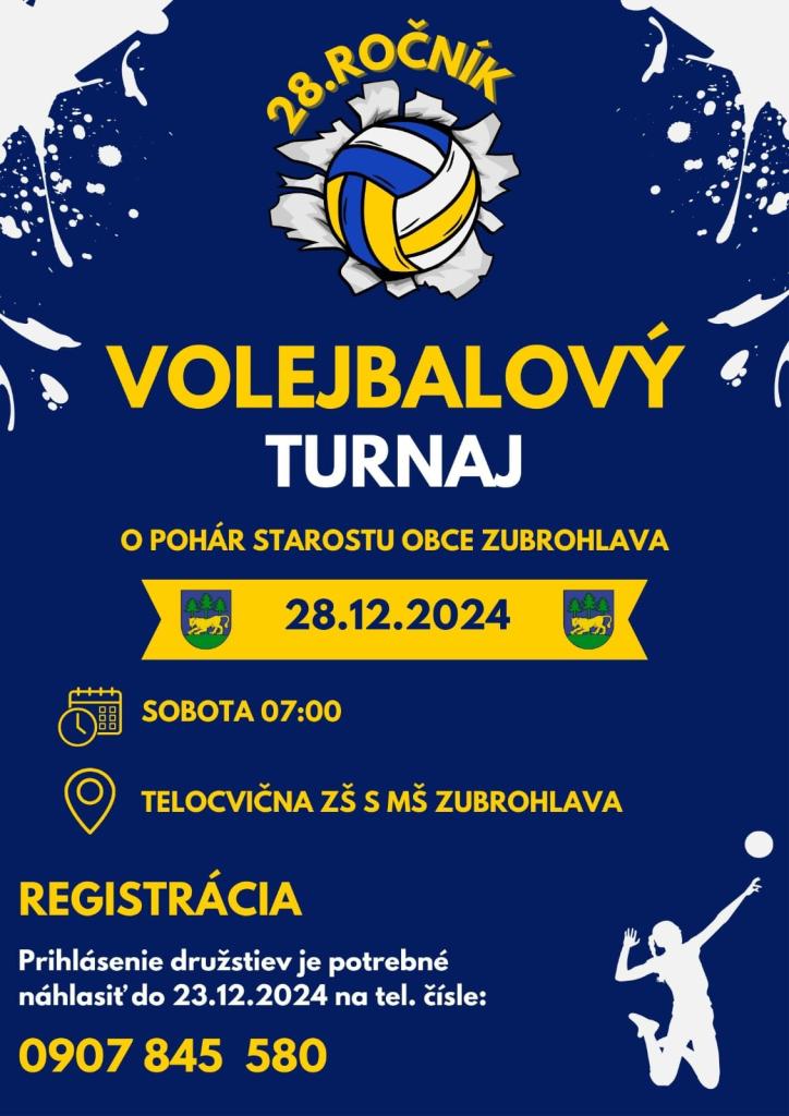 📢 POZVÁNKA NA 28. ROČNÍK VOLEJBALOVÉHO TURNAJA 🏐 Milí Zubrohlavčania, srdečne vás pozývame na tradičný volejbalový turnaj o Pohár starostu obce Zubrohlava, ktorý sa uskutoční: 📅 28. decembra 2024 (sobota) ⏰ Začiatok o 07:00 📍 Telocvičňa ZŠ s MŠ Zubrohlava ℹ️ Dôležité informácie: ✅ Turnaj je určený výhradne pre Zubrohlavčanov (obyvatelia, rodáci alebo ich syn, dcéra, manžel, manželka) ✅ Tímy môžu byť iba: Čisto ženské 👩🦰👩🦱 Čisto mužské 👨🦳👱♂️ ✅ Veková hranica: 18+ (každý tím môže mať jednu výnimku pre hráča vo veku 15-18 rokov). ✅ Registrácia tímov je potrebná najneskôr do 23. decembra 2024. 📞 Prihlásiť tím môžete na čísle: 0907 845 580 Príďte si užiť deň plný športu, dobrej nálady a zdravého súperenia! 🏆✨ Tešíme sa na vašu účasť! 🙌